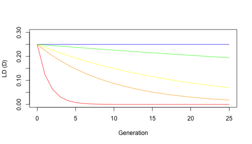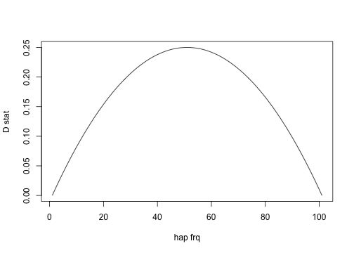 class: center, middle, inverse, title-slide .title[ # Linkage disequilibrium ] .author[ ### Jinliang Yang ] .date[ ### Jan. 16, 2026 ] --- # Two SNP Loci .pull-left[ <div align="center"> <img src="dogs.jpg" height=150> </div> ] .pull-right[ - dog 1: AA AA __TT__ CC __CC__ - dog 2: AA AA __CC__ CC __GG__ - dog 3: AA AA __CT__ CC __CC__ - dog 4: AA AA __CT__ CC __GC__ - dog 5: AA AA __CC__ CC __CC__ ] -- --------- .pull-right[ - dog 1: A A __T__ C __C__ / A A __T__ C __C__ - dog 2: A A __C__ C __G__ / A A __C__ C __G__ - dog 3: A A __C__ C __C__ / A A __T__ C __C__ - dog 4: A A __C__ C __G__ / A A __T__ C __C__ - dog 5: A A __C__ C __C__ / A A __C__ C __C__ ] ### Haplotype Phasing: - Involves separating maternally and paternally inherited copies of each chromosome into haplotypes to get a complete picture of genetic variation. --- # Two or more SNP loci The __expected haplotype frequency__ = the product of the frequencies of the individual alleles that make up the haplotype -- .pull-left[ <div align="center"> <img src="dogs.jpg" height=150> </div> ] .pull-right[ - dog 1: A A __T__ C __C__ / A A __T__ C __C__ - dog 2: A A __C__ C __G__ / A A __C__ C __G__ - dog 3: A A __C__ C __C__ / A A __T__ C __C__ - dog 4: A A __C__ C __G__ / A A __T__ C __C__ - dog 5: A A __C__ C __C__ / A A __C__ C __C__ ] #### Example: - Two loci: A and B with alleles `\(A_1\)` (T) `\(A_2\)` (C) and `\(B_1\)` (G) `\(B_2\)` (C) - Consider Haplotype `\(A_1B_2\)` ( __--T-C__ ) - Allele frequencies: `\(f_{A_1}=0.4\)` and `\(f_{B_2} = 0.7\)` -- - Expected frequency of the haplotype = `\(f_{A_1} \times f_{B_2} = 0.4 \times 0.7 = 0.28\)` - Observed haplotype freq = 4/10 = 0.4 --- # Linkage Equilibrium (LE) If the observed haplotype frequency fits expectations under HWE, the alleles are inherited independent of one another - They are in __Linkage Equilibrium__, `\begin{align*} f_{AB} & = p_Ap_B \\ f_{Ab} & = p_Ap_b = p_A(1-p_B) \\ f_{aB} & = p_ap_B = (1- p_A)p_B \\ p_{ab} & = p_ap_b = (1 - p_A)(1 - p_B) \\ \end{align*}` -- - Otherwise, would be in __Linkage Disequilibrium__ - Genotype frequencies are __not__ as expected with independent assortment (and HWE) `\begin{align*} f_{AB} & \ne p_Ap_B \\ f_{Ab} & \ne p_Ap_b = p_A(1-p_B) \\ f_{aB} & \ne p_ap_B = (1- p_A)p_B \\ p_{ab} & \ne p_ap_b = (1 - p_A)(1 - p_B) \\ \end{align*}` --- # Linkage Disequilibrium (LD) LD measures the extent to which alleles are associated - The non-random association between alleles at two loci -- ### Why do we care? - Linkage mapping - Information regarding effective population size/inbreeding - Can be leveraged to detect genome structural variation, i.e., inversion --- # Linkage Disequilibrium (LD) .pull-left[ <div align="center"> <img src="ld.png" width=300> </div> ] .pull-right[ - Allele at one locus is correlated with allele at 2nd locus - Non-random association of alleles ] --- # Measuring LD: `\(D\)` Statistics `\(D\)` stat measures the deviation of haplotype frequencies from expected values based on allele frequencies. `\begin{align*} D_{AB} & = f_{AB} - p_Ap_B \\ \end{align*}` - `\(f_{AB}\)` is the observed freq of AB haplotype - `\(p_Ap_B\)` is the expected freq given allele freqs - If `\(D = 0\)`, the alleles are inherited independently. -- `\begin{align*} D_{AB} & = D_{ab} \\ & = -D_{Ab} = -D_{aB} \end{align*}` --- # Measuring LD: `\(D\)` Statistics `\begin{align*} D_{AB} & = f_{AB} - p_Ap_B \\ \end{align*}` ------------ .pull-left[ <div align="center"> <img src="ld.png" width=300> </div> ] -- .pull-right[ Observed: - `\(p_{AB} = 3/10 = 0.3\)` Expected: - `\(p_A = 3/10 = 0.3\)` - `\(p_B = 3/10 = 0.3\)` - `\(p_Ap_B = 0.3 \times 0.3 = 0.09\)` LD: - `\(D_{AB} = 0.3 - 0.09 = 0.21\)` ] -- `\(D_{AB} \ne 0\)` - A and B alleles are observed together more often than expected - These two alleles are in LD --- # Summary of LD | Gamete | AB | Ab | aB | ab | | :-------: | : ------ : | :-------: | :-------: | :-------: | | Observed | `\(f_{AB}\)` | `\(f_{Ab}\)` | `\(f_{aB}\)` | `\(f_{ab}\)` | | | `\(r\)` | `\(s\)` | `\(t\)` | `\(u\)` | | Expected (HWE) | `\(p_Ap_B\)` | `\(p_Aq_b\)` | `\(q_ap_B\)` | `\(q_aq_b\)` | | Obs - Exp | `\(+D\)` | `\(-D\)` | `\(-D\)` | `\(+D\)` | -- - `\(r\)` and `\(u\)`: coupling gametes (AB and ab) - `\(s\)` and `\(t\)`: repulsion gametes (Ab and aB) -- Here, we know: `\begin{align*} p_A & = f_{AB} + f_{Ab} \\ p_B & = f_{AB} + f_{aB} \\ \end{align*}` -- And `\begin{align*} D_{AB} & = f_{AB} - p_Ap_B \\ & = f_{AB} - (f_{AB} + f_{Ab})(f_{AB} + f_{aB}) = r - (r + s)(r + t) \\ & = r - r^2 - rt -sr -st = r(1 -r - t -s) - st \\ & = ru -st \\ \end{align*}` --- # Summary of LD | Gamete | AB | Ab | aB | ab | | :-------: | : ------ : | :-------: | :-------: | :-------: | | Observed | `\(f_{AB}\)` | `\(f_{Ab}\)` | `\(f_{aB}\)` | `\(f_{ab}\)` | | | `\(r\)` | `\(s\)` | `\(t\)` | `\(u\)` | | Expected (HWE) | `\(p_Ap_B\)` | `\(p_Aq_b\)` | `\(q_ap_B\)` | `\(q_aq_b\)` | | Obs - Exp | `\(+D\)` | `\(-D\)` | `\(-D\)` | `\(+D\)` | - `\(r\)` and `\(u\)`: coupling gametes (AB and ab) - `\(s\)` and `\(t\)`: repulsion gametes (Ab and aB) ---------- `\begin{align*} D & = ru -st \\ \end{align*}` ### D = coupling gametes - repulsion gametes --- # Range of `\(D\)` through simulation ``` r fab <- seq(0, 1, by=0.01) pa <- seq(0, 1, by=0.01) pb <- seq(0, 1, by=0.01) plot(fab - pa * pb, type ="l", ylab="D stat", xlab="hap frq") ``` <!-- --> --- # Range of `\(D\)` If all gametes are AB or ab (completely linked) and `\(P_A =P_B = 0.5\)` `\begin{align*} D_{AB} & = f_{AB} - p_Ap_B = 0.5 - 0.5 \times 0.5 = 0.25 \\ D_{AB} & = -D_{Ab} \end{align*}` Therefore, __ `\(D\)` ranges from `\(-0.25\)` to `\(0.25\)`__ -- - In real life, this range is not usually maximized and can be determined by allele frequencies - Due to dependence on allele frequencies, D cannot be compared between different sets of loci --- # Measuring LD: `\(D'\)` Richard Lewontin described how to normalize D for easier interpretation `\begin{align*} D' & = \frac{D}{D_{max}} \end{align*}` -- ------------